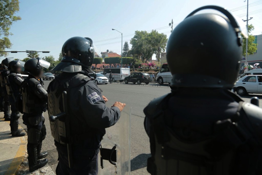Morelia, Michoacán, a 12 de marzo de 2018.- La Secretaría de Seguridad Pública (SSP) mantiene presencia policial sobre Periférico Paseo de la República, a la altura de Casa de Gobierno, previo a la movilización que integrantes de la Sección 18 de la Coordinadora Nacional de Trabajadores de la Educación (CNTE) realizarán en esta capital.