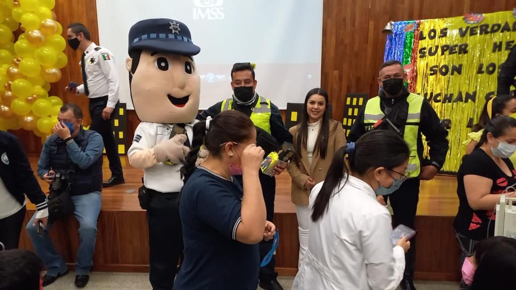 Charo, Mich., 15 de Febrero del 2023.- En un esfuerzo por fortalecer los trabajos que coadyuven en la reducción del sufrimiento de los niños y niñas, personal de las direcciones de Atención Física y Psicológica (DAFP) y de Tránsito y Movilidad, de la Secretaría de Seguridad Pública (SSP), acudió a la conmemoración del Día Internacional del Cáncer Infantil, llevado a cabo en el IMSS Hospital General No. 1, ubicado en el municipio de Charo.