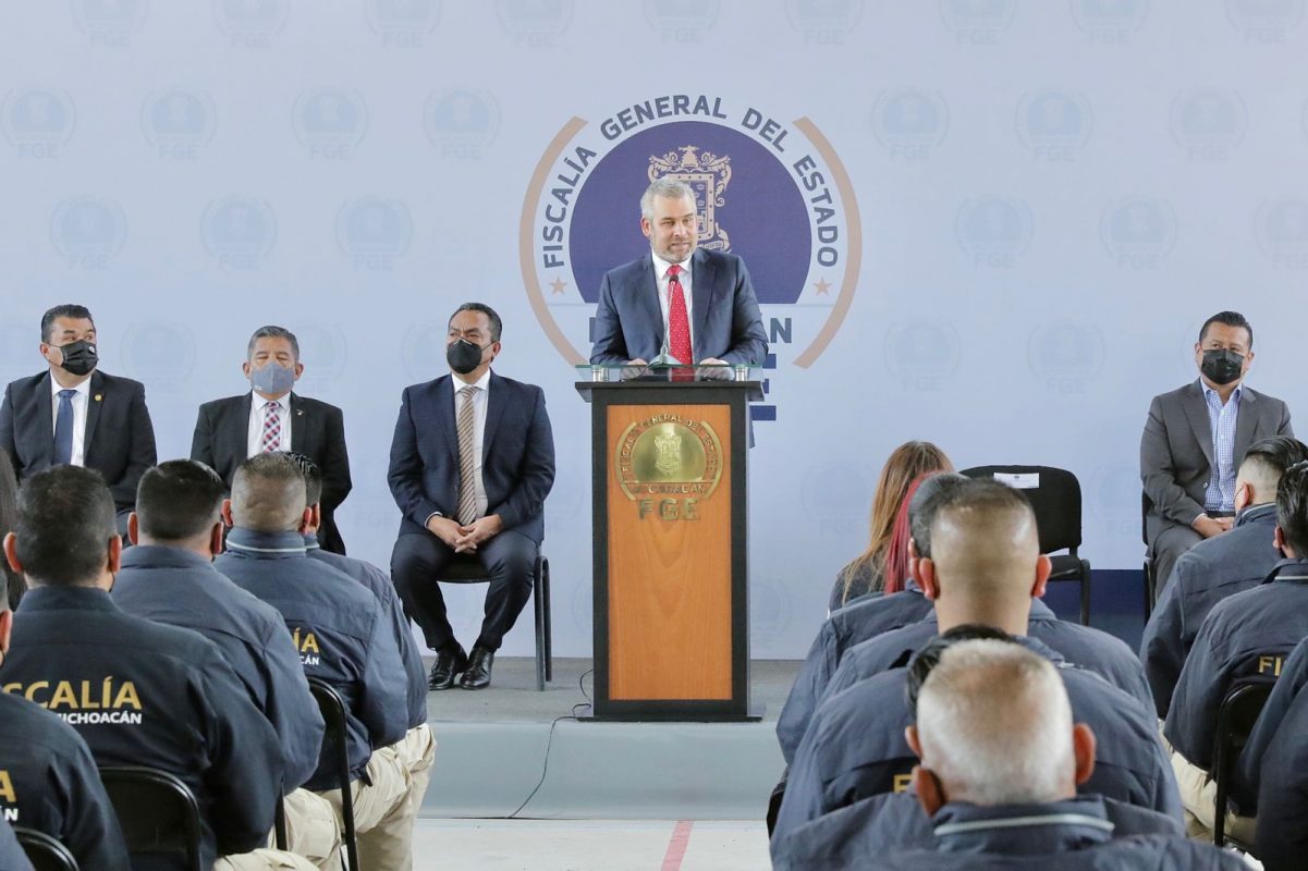 Morelia, Micho., a 09 de Febrero del 2022.- Al encabezar el acto de entrega de Certificado Único Policial (CUP) para Agentes de Investigación de la Fiscalía General del Estado (FGE), el gobernador Alfredo Ramírez Bedolla, destacó el trabajo coordinado que se realiza entre las instituciones de seguridad para combatir la impunidad en Michoacán.