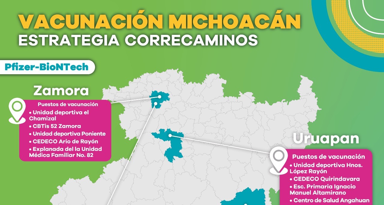 Los municipios con puestos de vacunación activa son: Jacona, Zamora, Hidalgo, Churumuco, Aguililla, Uruapan, Huetamo, y Lázaro Cárdenas; mientras que, en Villamar, La Huacana, Tingambato, Buenavista, Tepalcatepec, Apatzingán, Parácuaro, Múgica, Angangueo, Coalcomán y Áporo, se concluyó con la aplicación de dosis designadas.