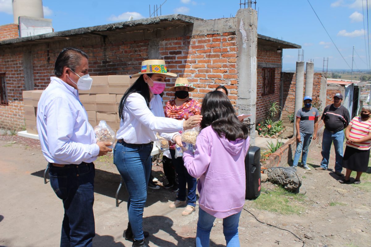 En Numarán visitó la colonia Santa Cruz en donde entregó 300 despensas a familias y 1000 desayunos escolares a niñas y niños; además de cinco toneladas de cemento para una jornada de bacheo.