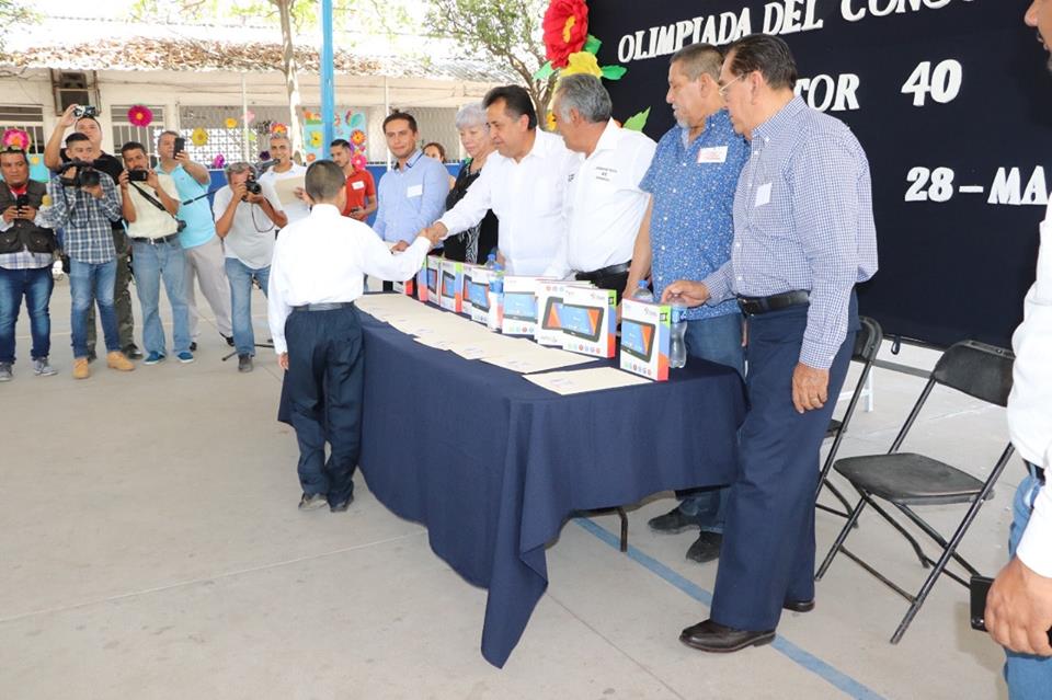 Apatzingán, Mich., a 28 de marzo de 2019.- Como parte del compromiso que tiene la administración municipal, con el sector educativo y con los estudiantes destacados, el alcalde, José Luis Cruz Lucatero, entregó 12 tablets a los alumnos que participaron en la Olimpiada del Conocimiento del sector 40 de educación primaria.