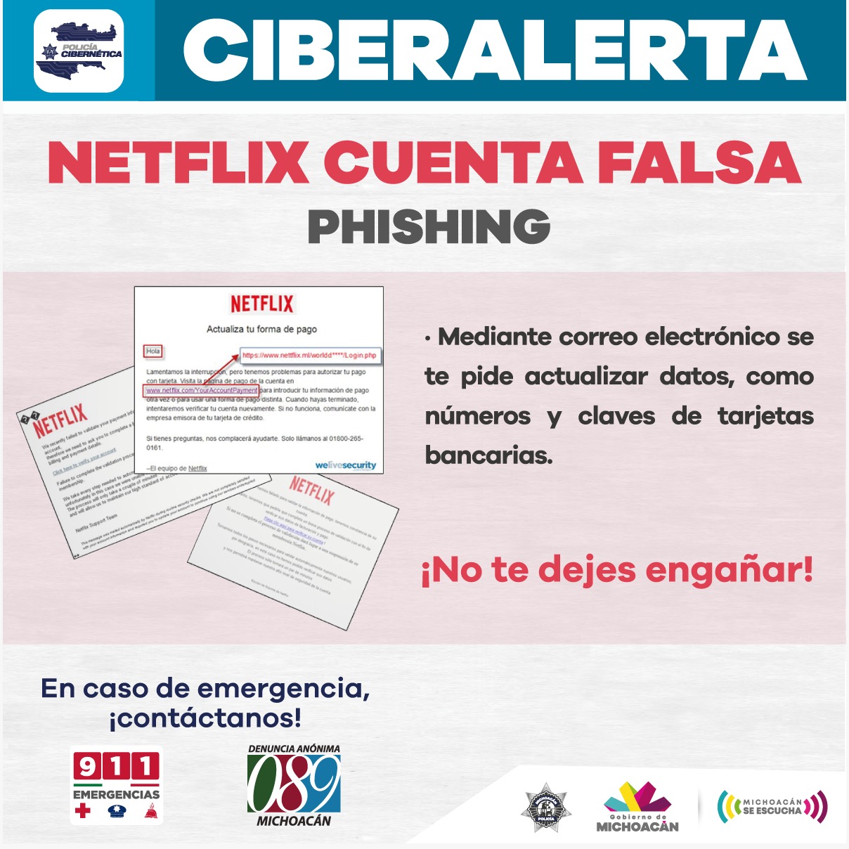 Morelia, Michoacán, a 9 de abril de 2019.- A fin de evitar ser víctima de robo de información personal, la Unidad Cibernética de la Secretaría de Seguridad Pública (SSP), alerta a la ciudadanía sobre un nuevo “phishing” de la empresa estadounidense de entretenimiento Netflix.