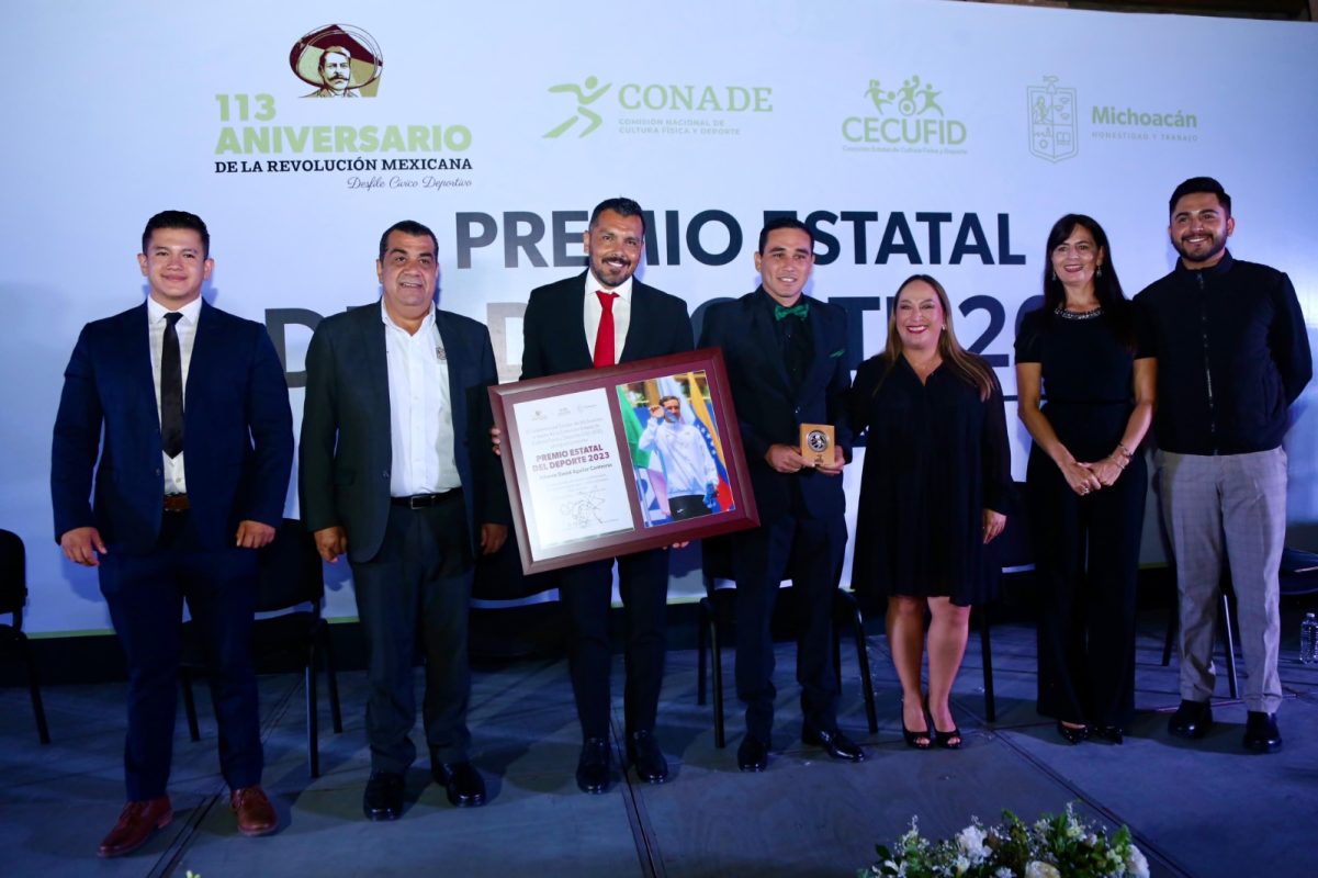 Morelia, Mich., 22 de Noviembre de 2023.- El surfista Alfonso Aguilar Contreras, fue condecorado con el Premio Estatal del Deporte 2023, lo que lo convirtió en el primer atleta oriundo de la Costa Michoacana en obtener dicha distinción, que se entrega en el marco de las festividades conmemorativas del inicio de la Revolución Mexicana.