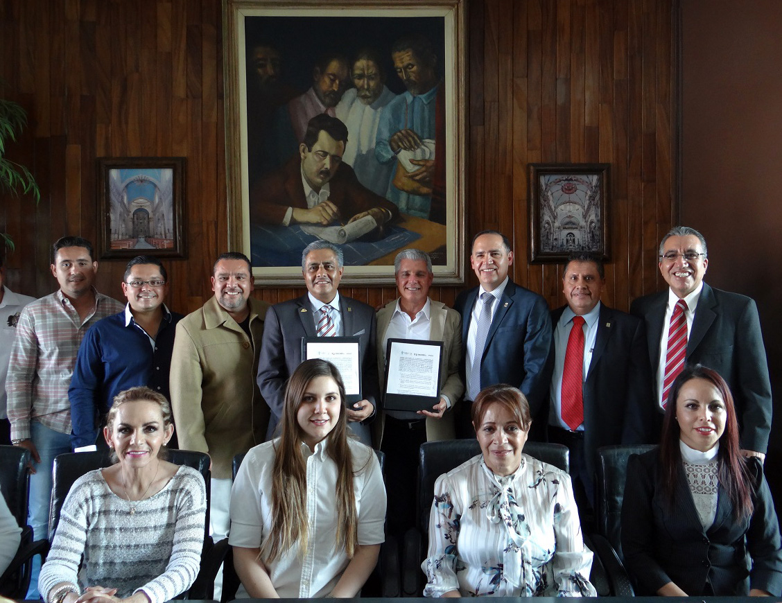 Sahuayo, Mich, a 10 de marzo de 2017.- En cumplimiento a la encomienda del Gobernador Silvano Aureoles Conejo de respaldar el proyecto para la apertura de dos grupos adicionales en este municipio –los cuales pertenecerán al plantel Cojumatlán de Régules-, el director general del Colegio de Bachilleres del Estado de Michoacán (Cobaem), Alejandro Bustos Aguilar, y el alcalde de Sahuayo, Rodrigo Sánchez Zepeda, firmaron el convenio de colaboración para la operación de servicios educativos de nivel medio superior del subsistema.