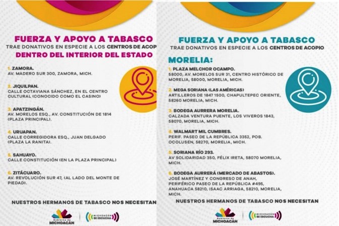 Hasta el momento se han recolectado más de 24 toneladas de víveres, 20 en Morelia y cuatro en el interior del estado, mismas que serán enviadas en apoyo a las 141 mil personas damnificadas en Tabasco.