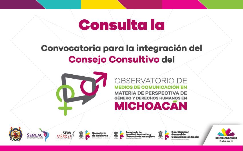Morelia, Michoacán, a 28 de septiembre de 2018.- Tras la gran aceptación que causó la presentación del primer Consejo Consultivo del Observatorio Estatal de Medios en Materia de Perspectiva de Género y Derechos Humanos a nivel nacional, se amplió la convocatoria de registros hasta el 5 de octubre del presente año.