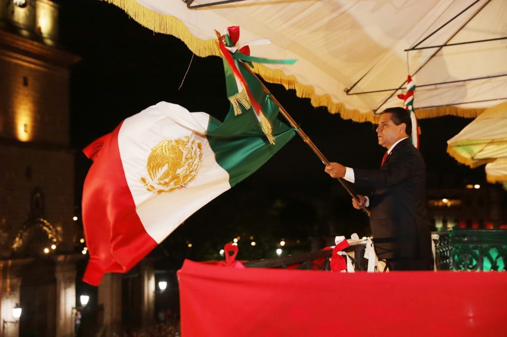 “¡Viva México¡, ¡viva Morelos!, ¡viva Hidalgo!, ¡vivan los héroes que nos dieron patria!, ¡Viva México!, ¡Viva la Reconciliación y La Paz!, ¡viva Michoacán!”, enfatizó el mandatario estatal, quien hizo repicar la campana de Palacio de Gobierno y ondeó la Bandera Nacional.