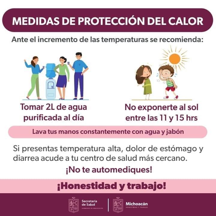 Morelia, Mich., 11 de Junio de 2023.- De acuerdo con el reporte emitido por el Sistema Meteorológico Nacional, se prevé que continúe la tercera ola de calor con temperaturas máximas de entre 40 y 45 grados en 20 estados del país, entre ellos Michoacán, es así que la Secretaría de Salud del Estado (SSM) exhorta a la población a extremar precauciones para evitar golpes de calor y deshidratación.
