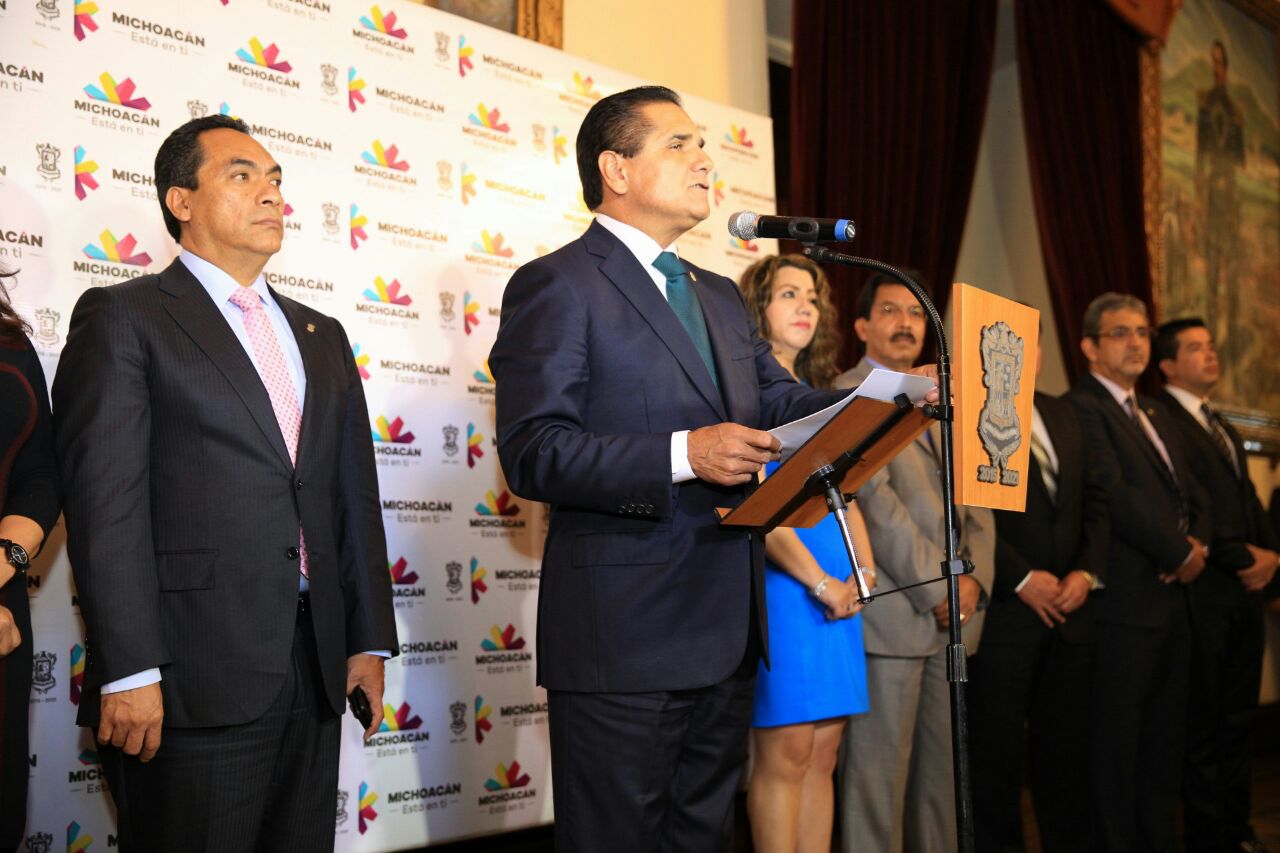 Morelia, Michoacán, a 16 de octubre de 2017.- Con la firme convicción de reforzar el trabajo en las diversas dependencias gubernamentales, así como las acciones a favor del estado que permitan consolidar un escenario de más y mejores condiciones para el desarrollo de las y los michoacanos, el Gobernador Constitucional Silvano Aureoles Conejo anunció ajustes en su Gabinete.
