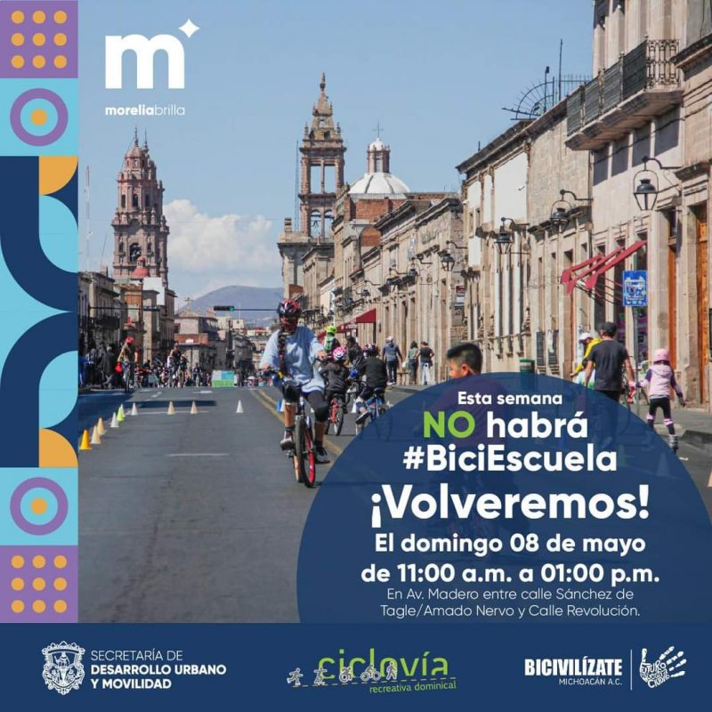Morelia, Mich., a 29 de Abril del 2022.- La Secretaría de Desarrollo Urbano y Movilidad de Morelia informa a las y los morelianos que la actividad de la “Biciescuela” que se realiza en el marco de la ciclovía dominical, será suspendida este domingo 01 de mayo debido a la marcha que se realiza año con año por el Día del Trabajo.