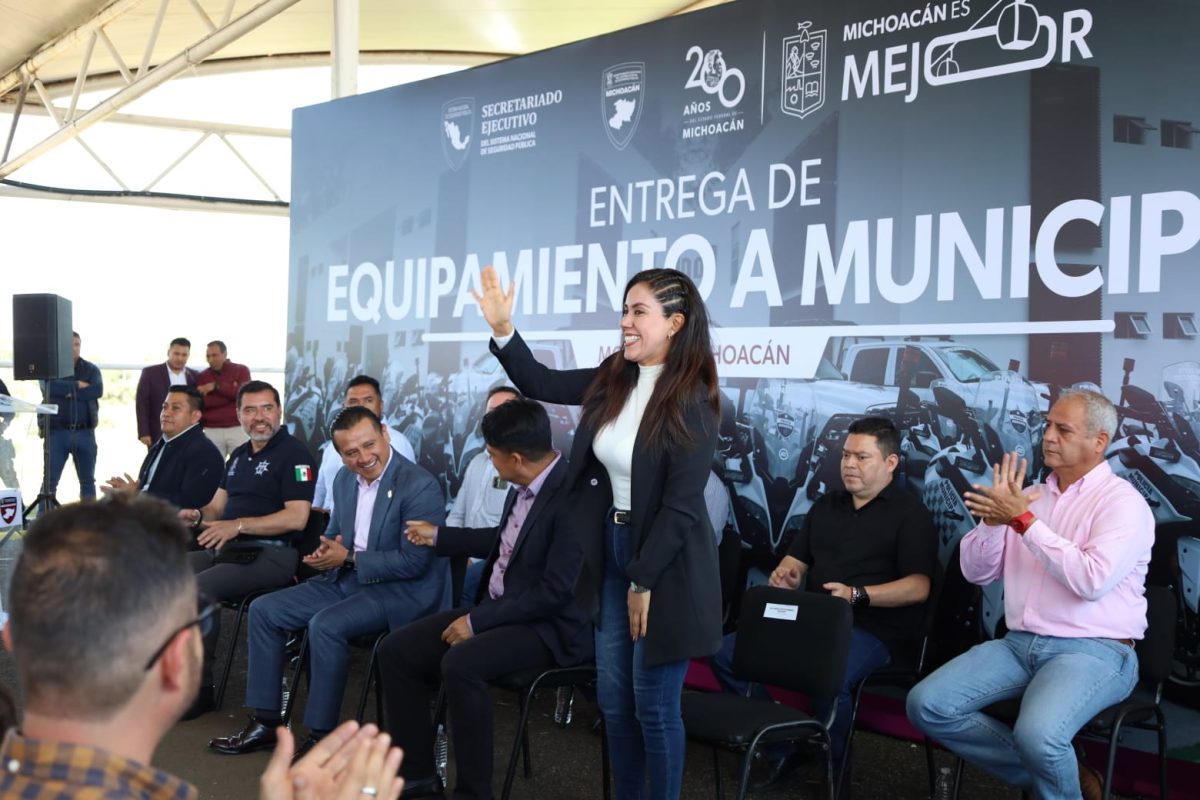 Durante el evento organizado por la secretaría de Seguridad Pública, la presidenta municipal, Fanny Arreola Pichardo, reconoció al gobernador del Estado, Alfredo Ramírez Bedolla la visión municipalista para fortalecer en diversos aspectos, particularmente en seguridad para los municipios.