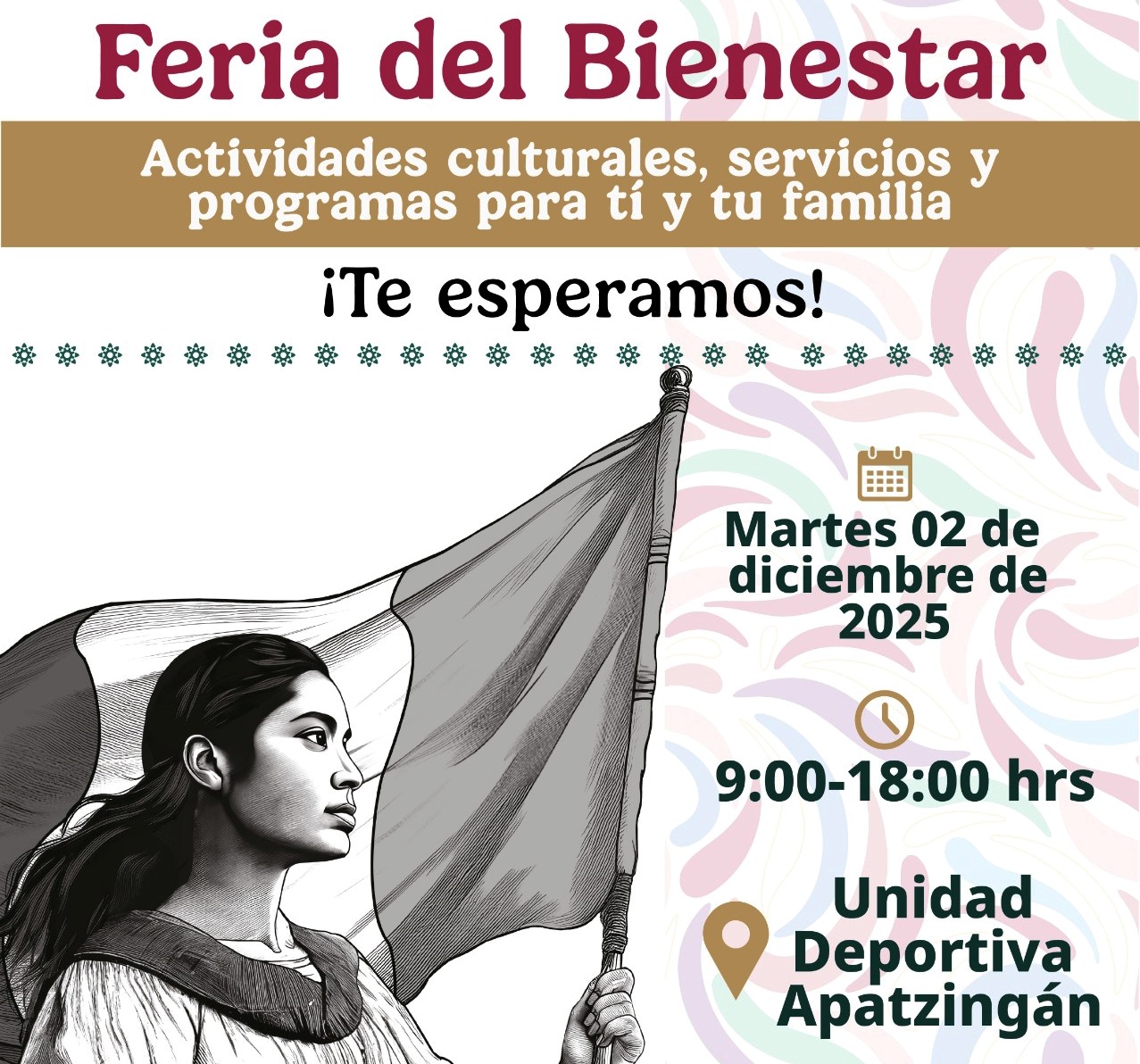 Apatzingán Mich, a 29 de Noviembre 2025.- Unidad Deportiva, martes 2 de diciembre de 2025, de 9:00 a 18:00 horas. En el marco del Plan Michoacán por la Paz y la Justicia, Apatzingán recibirá este martes la Feria del Bienestar, una jornada integral que reunirá actividades culturales, servicios gratuitos y programas sociales dirigidos a niñas, niños, jóvenes, adultos mayores y familias completas.