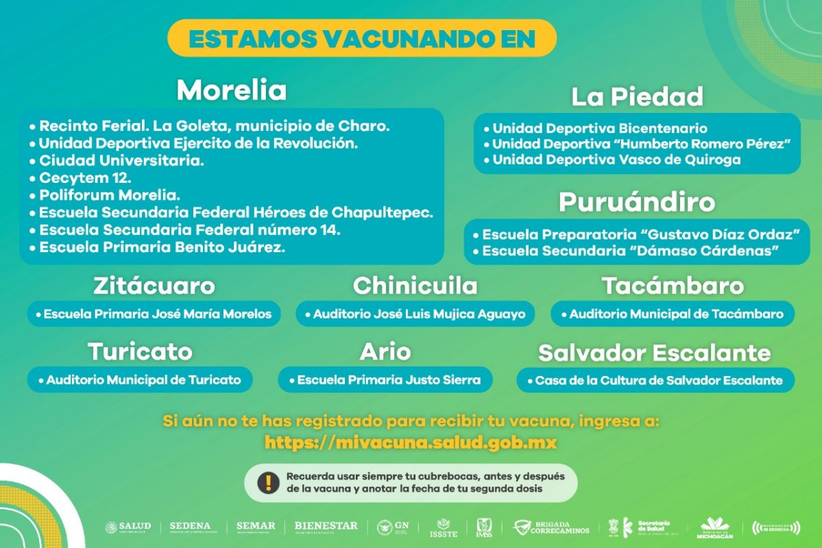 Este sábado la vacunación se mantiene activa en Morelia, La Piedad, Puruándiro, Salvador Escalante, Tacámbaro, Chinicuila, Ario, Zitácuaro y Turicato.