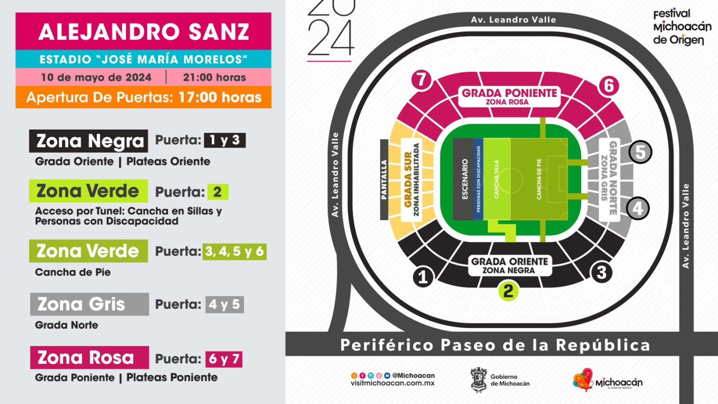 Morelia, Mich.,  8 de Mayo de 2024.-La fecha se acerca para que Alejandro Sanz llegue por primera vez a Michoacán y aquí te contamos cuáles serán los accesos por donde deberás ingresar para ubicar la zona de tu boleto, a partir de las 17:00 horas.