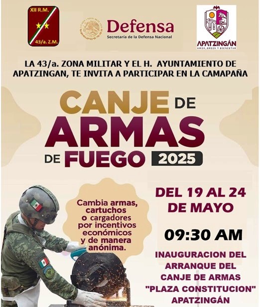 Apatzingán, Mich,a 17 de Mayo 2025.- La Comandancia de la 43/a. Zona Militar con sede en Apatzingán por conducto del 30 Batallón Infantería y en coordinación con el H. Ayuntamiento de Apatzingán; realizarán este Lunes 19 Mayo La instalación de módulos de campaña de canje de armas.