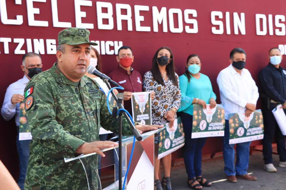 Apatzingán, Mich., a 20 de Diciembre del 2021.- Con la finalidad de concluir el año 2021 y comenzar el 2022 con saldo blanco, las autoridades municipales y de seguridad dieron el banderazo de arranque del operativo “Celebremos sin disparos” exhortando a la ciudadanía a no usar armas de fuego durante las celebraciones de Navidad y Año Nuevo, ya que dicha práctica podría enlutar a una familia.