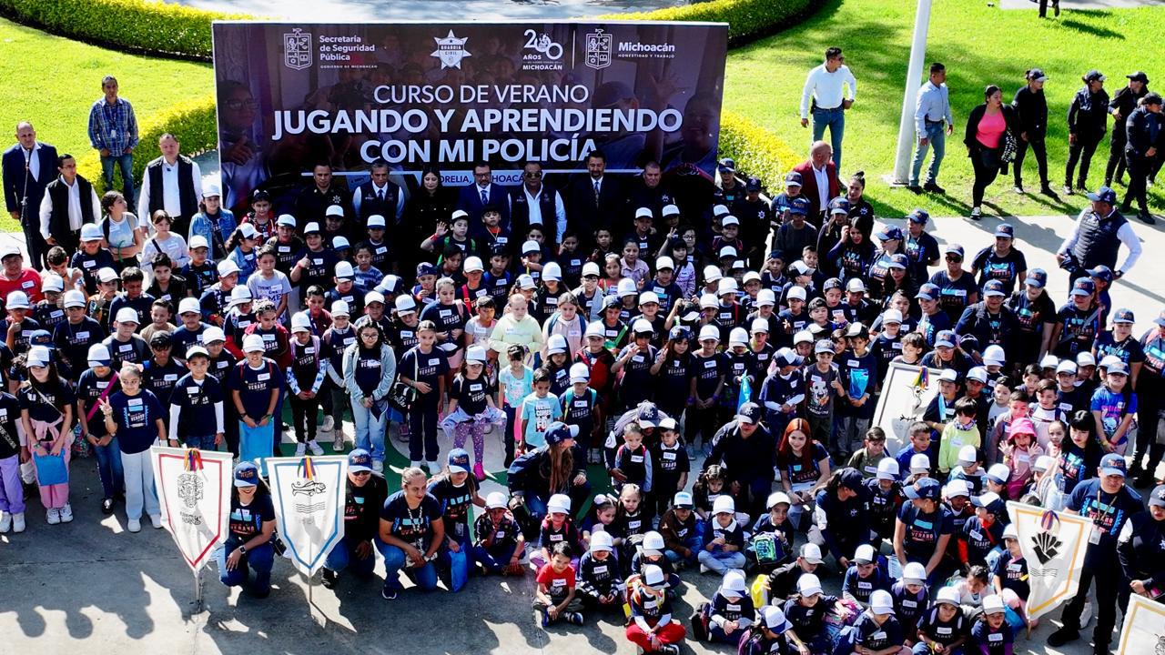 Morelia, Mich., 6 de Agosto de 2024.- Cerca de 300 niños y niñas iniciaron este día el curso de verano denominado, Jugando y aprendiendo con mi policía, con el pase de lista de la Guardia Civil en la explanada de la Secretaría de Seguridad Pública (SSP).