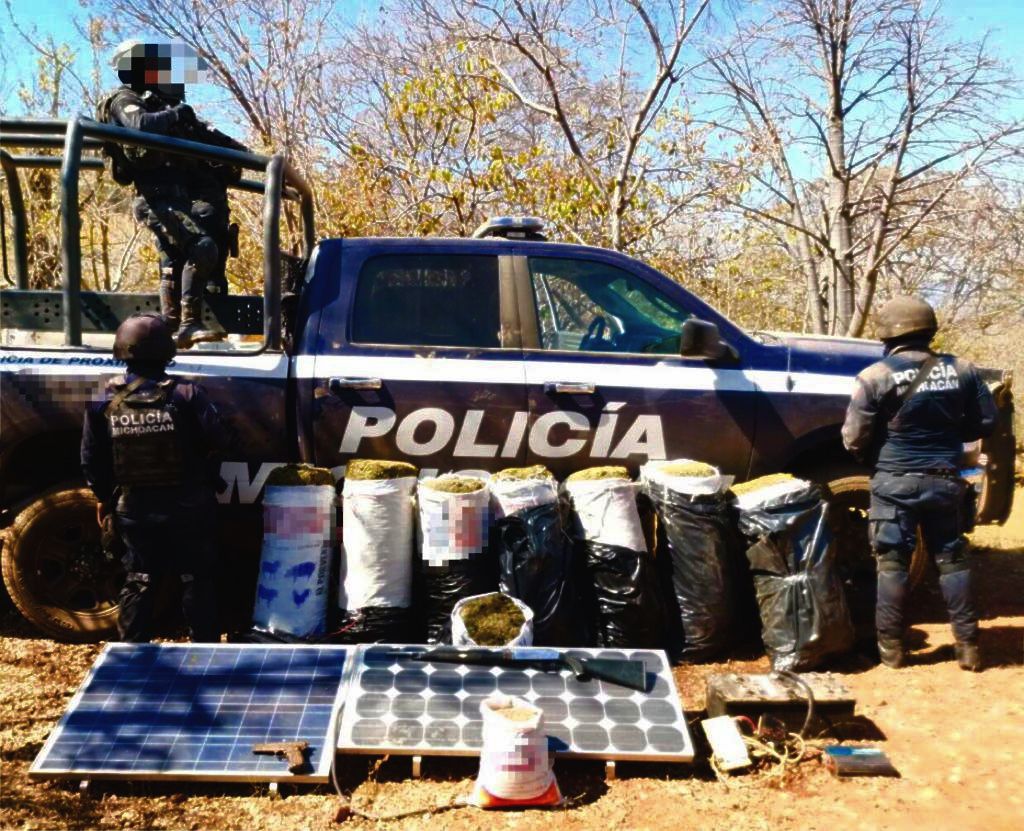 Tuzantla, Michoacán, a 6 de febrero de 2019.- Derivado de labores de prevención y vigilancia en distintas localidades de esta demarcación, elementos de la Policía Michoacán aseguraron 200 kilos de marihuana, armas de fuego, paneles solares y un repetidor de radio-comunicación.