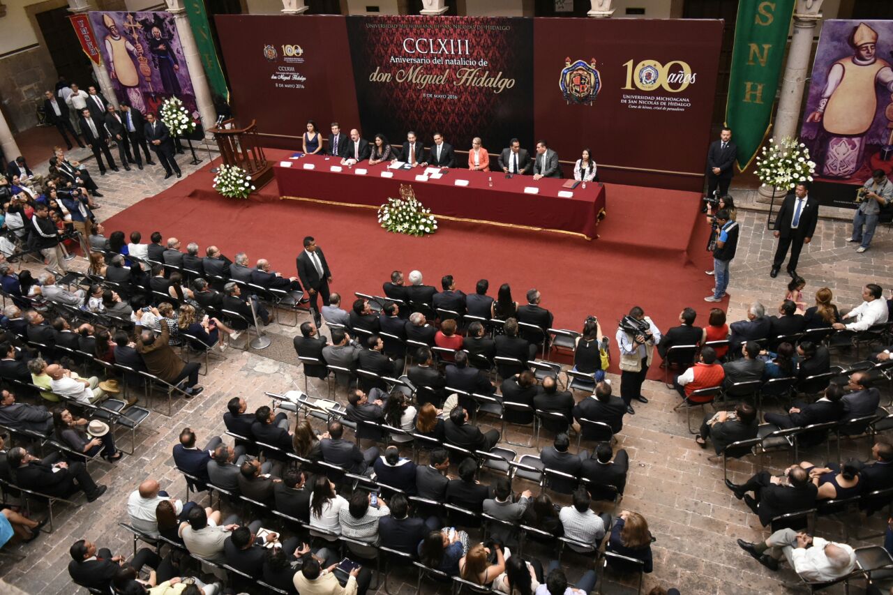 En el evento organizado por la Universidad Michoacana de San Nicolás de Hidalgo, y en que estuvo presente su rector, Medardo Serna González, así como el secretario de Gobierno, Adrián López Solís, a nombre de los docentes la profesora María Cristina Soto Ayala, y en representación del alumnado, Mónica Ramírez Ruiz, se pronunciaron por rescatar los ideales de Hidalgo para hacer frente a la pobreza, la corrupción, la desigualdad, la discriminación, la inseguridad, con una actitud crítica pero propositiva.