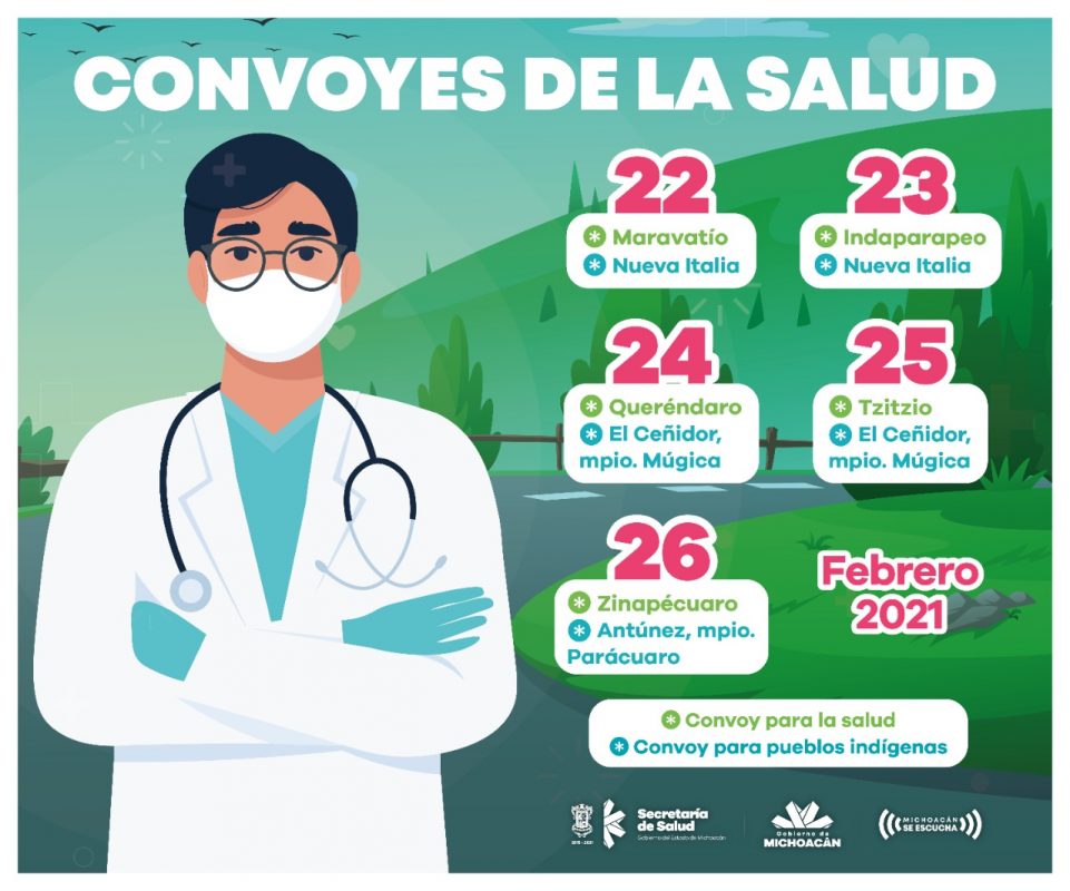 Morelia, Mich, a 21 de febrero de 2021.- La Secretaría de Salud de Michoacán (SSM), informa a la población sobre los lugares en los que se encontrarán los Convoyes de Salud y de Pueblos Indígenas, del 22 al 26 de febrero, otorgando servicios gratuitos.