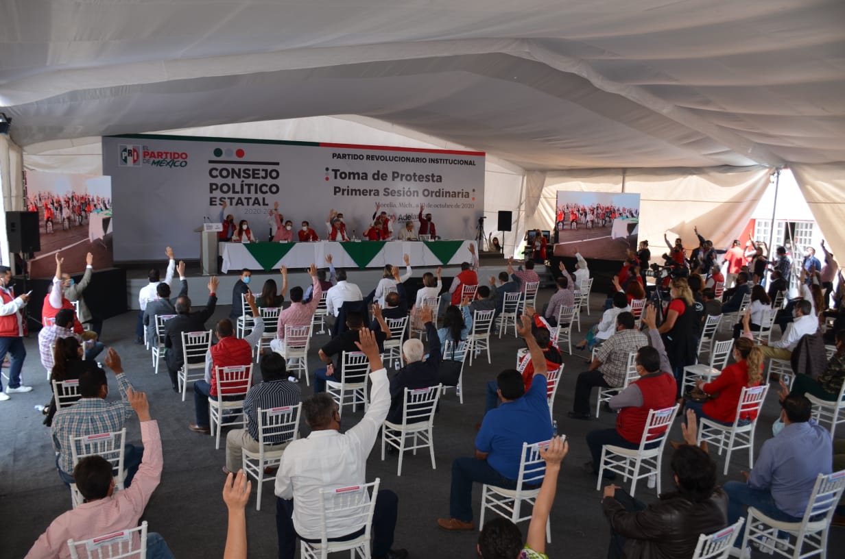 Morelia, Mich., a 11 de Octubre de 2020. En la primera sesión ordinaria del Consejo Político los integrantes del máximo órgano del PRI aprobaron por mayoría la autorización al presidente del Comité Directivo Estatal Jesús Hernández Peña para iniciar pláticas con los dirigentes de otros institutos políticos para la celebración de Alianzas y Coaliciones parciales o totales y/o candidaturas comunes.