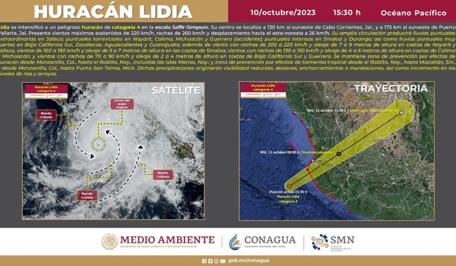 Ciudad de México, 10 de Octubre de 2023.- El Servicio Meteorológico Nacional (SMN), de la Comisión Nacional del Agua (Conagua), informa que el huracán Lidia alcanzó ya la categoría 4 en la escala Saffir-Simpson.