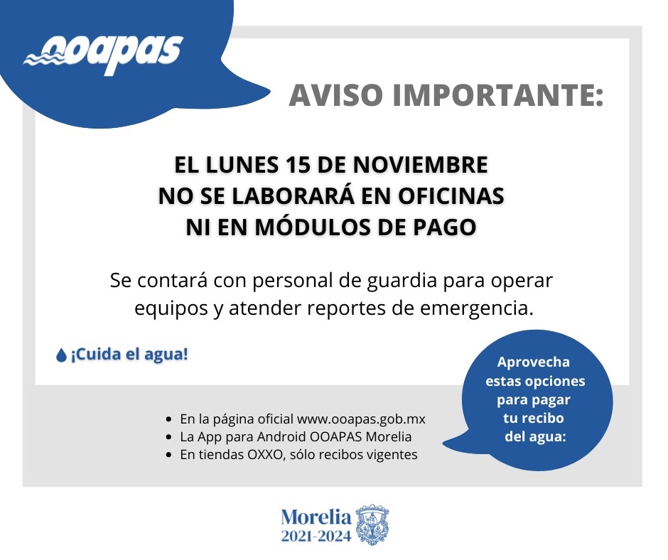 Morelia, Mich., a 13 de noviembre de 2021.- El Organismo Operador de Agua Potable, Alcantarillado y Saneamiento de Morelia (OOAPAS) informa que de acuerdo con el calendario oficial, el próximo lunes 15 de noviembre será día inhábil, por lo que no se laborará en oficinas administrativas ni módulos de pago de la paramunicipal.