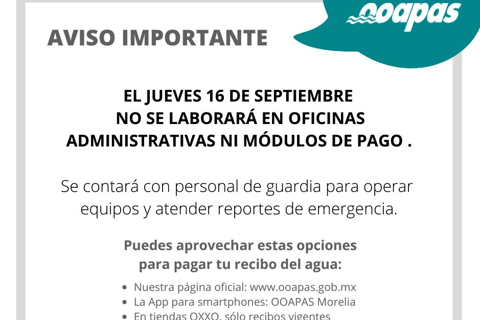 Morelia, Mich., a 14 de Septiembre de 2020.- El Organismo Operador de Agua Potable, Alcantarillado y Saneamiento de Morelia (OOAPAS) informa que de acuerdo con el calendario oficial, el próximo jueves 16 de septiembre será día inhábil, por lo que no se laborará en oficinas administrativas ni módulos de pago de la paramunicipal.