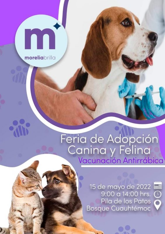 Morelia, Mich., a 12 de Mayo del 2022.- Con el objetivo de fomentar el respeto, cuidado y adopción de animales de compañía, el próximo 15 de mayo el Gobierno de Morelia, a través de la Secretaría de Servicios Públicos, invita a las y los morelianos a la feria de Adopción canina y felina.