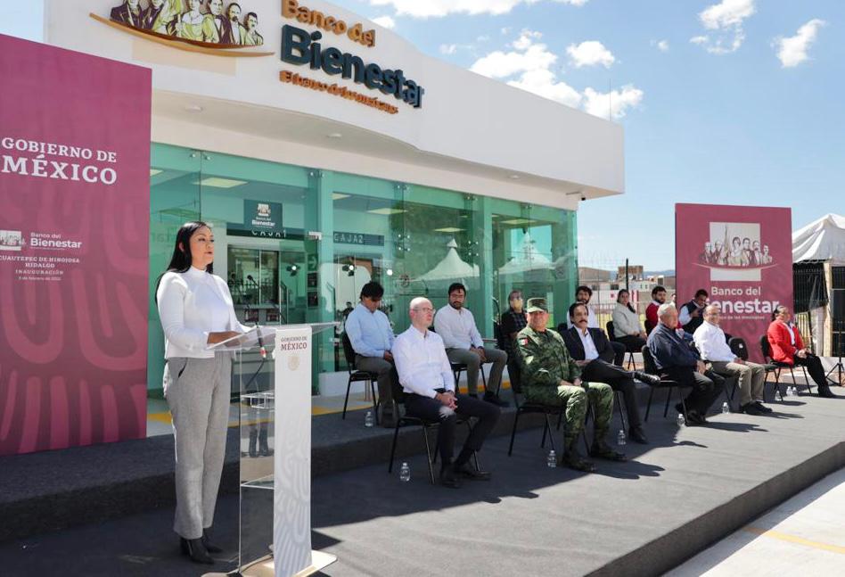 Cautepec de Hinojosa, Hidalgo, a 04 de Febrero del 2022.- Este jueves, la secretaria de Bienestar, Ariadna Montiel Reyes, acompañó al presidente Andrés Manuel López Obrador, a la inauguración de sucursales del Banco del Bienestar en Cuautepec de Hinojosa y Ciudad Sahagún, Tepeapulco, en Hidalgo.El primer mandatario resaltó que con las sucursales del Banco del Bienestar el pago de las pensiones y programas será de manera directa y sin intermediarios para que llegue completo; además, resaltó que el pueblo es el motor del cambio con el que se lleva a cabo la transformación de México, por lo se continuará apoyando a través de los Programas para el Bienestar.En tanto, Ariadna Montiel Reyes, aseguró que “este es un día realmente especial para México, pues se inauguran las primeras sucursales de un proyecto profundamente transformador para el pueblo de México: el Banco del Bienestar, el banco de todos los mexicanos”.Enfatizó que dichas sucursales serán un centro de encuentro para las comunidades que integrarán a las y los ciudadanos a los beneficios y programas que el Gobierno de México ofrece.Abundó que los programas sociales llegan a quienes más lo necesitan sin importar qué tan alejados estén de los centros urbanos; sin embargo, al no tener cerca sucursales de banco, el pago de sus pensiones o programas se hace en efectivo, de ahí la trascendencia de que el Banco del Bienestar comience a llegar a todos los rincones del país.“Este acto no es solo la apertura de una institución que acerca sus servicios a quienes se han visto relegados de la bancarización, sino un acto de restitución a la dignidad de todos los habitantes”, afirmó.Recordó que gracias a que existe un gobierno del pueblo y para el pueblo, ya suman 10 millones de adultos mayores y un millón de niñas y niños con discapacidad permanente que reciben su Pensión para el Bienestar; además, 450 mil sembradoras y sembradores trabajan sus parcelas con apoyo del programa Sembrando Vida, entre otras acciones.Precisó que en Hidalgo 267 mil personas adultas mayores, 21 mil 500 personas con discapacidad permanente, 11 mil sembradoras y sembradores, cuatro mil 850 madres trabajadoras y nueve mil 639 micronegocios ya son beneficiados por la política de bienestar.Por ello, la secretaria de Bienestar refrendó el compromiso de seguir trabajando para que todas y todos reciban sus apoyos de manera directa y sin intermediarios, a través de su tarjeta en coordinación con el Banco del Bienestar.“El gobierno de la Cuarta Transformación reitera su compromiso con el bienestar de todas y todos los mexicanos, pero desde una orientación ética y profundamente humana”, subrayó