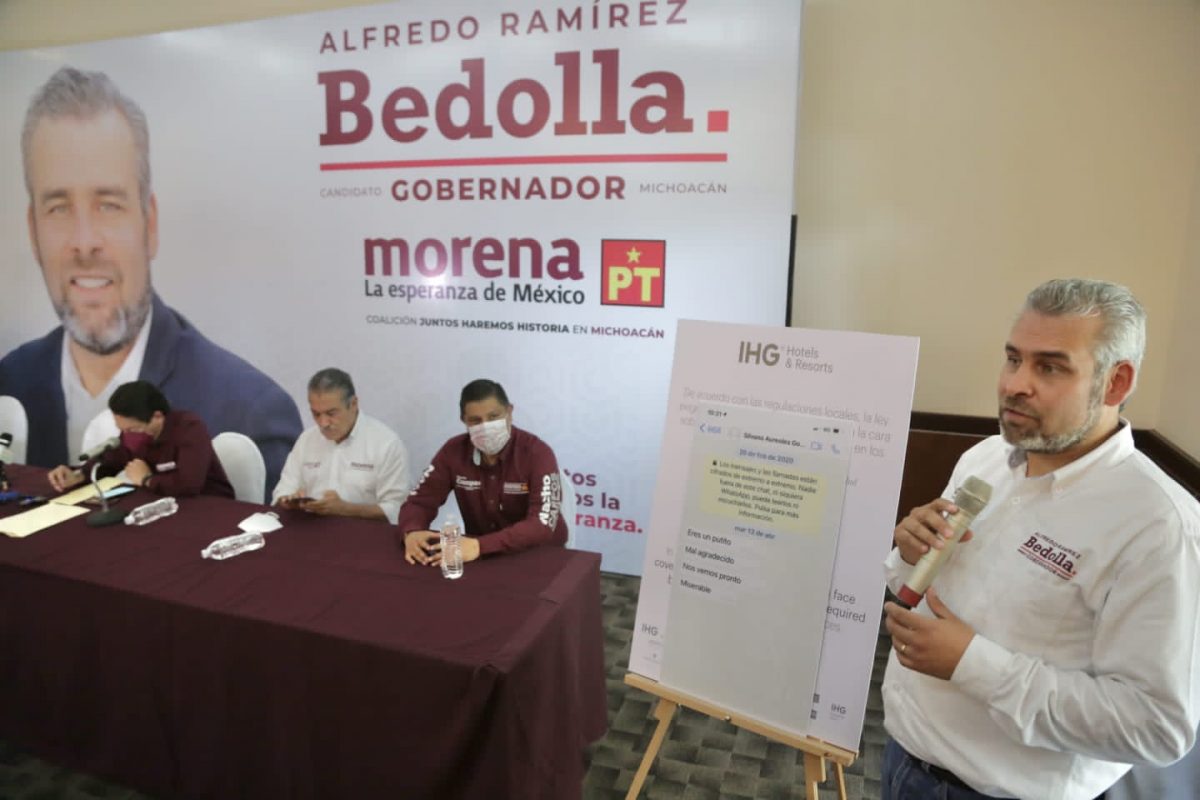 Mario Delgado y Alfredo Ramírez, acompañados también por el dirigente estatal de Morena, Raúl Morón Orozco, y el candidato a presidente municipal de Uruapan, Ignacio Campos, hicieron un llamado a quienes han sido amenazados por el gobernador a denunciar actos intimidatorios, «porque es inadmisible vivir en un estado de amenaza».