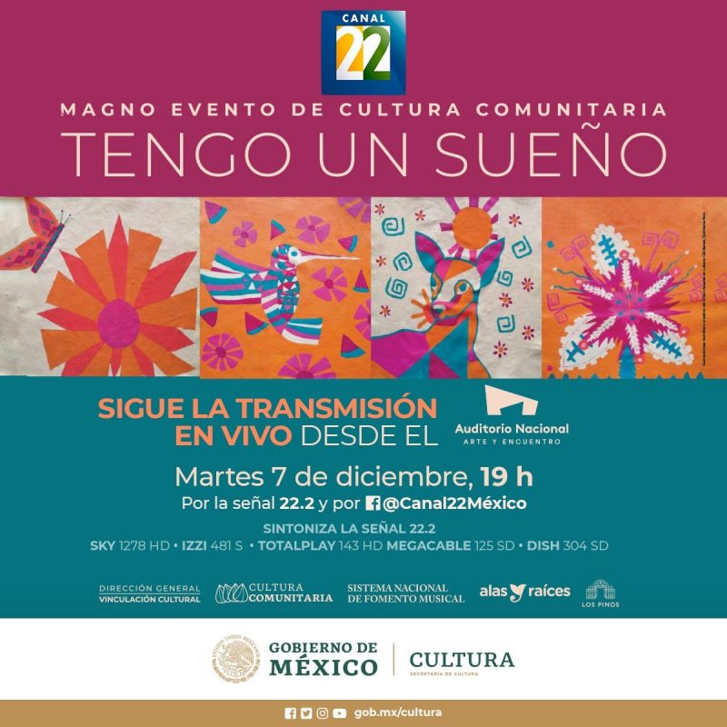 Ciudad de México, a 07 de Diciembre del 2021.- Canal 22, institución de la Secretaría de Cultura del Gobierno de México, transmitirá en vivo a través de su señal 22.2 el “Magno evento de Cultura Comunitaria Tengo un sueño 2021”, un espectáculo multidisciplinario en el que se conjuga el talento de 1,955 niñas, niños y jóvenes de 129 Semilleros creativos de 111 municipios de los 32 estados del país, hoy martes 7 de diciembre a las 19:00 horas.