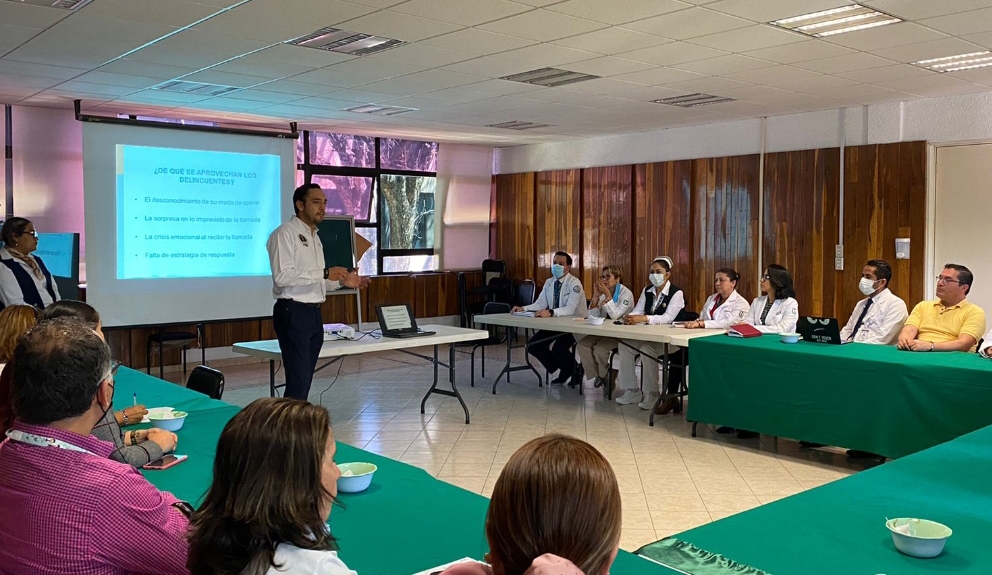 En esta actividad, en la que participaron 40 empleados del departamento del Órgano de Operación Administrativa Desconcentrada (OODA) del IMSS, personal de la UECS explicó que dichos actos se realizan telefónicamente por personas que, en la mayoría de los casos, se encuentran privados de su libertad en los centros penitenciarios de la República, con la finalidad de obtener dinero de la persona a la que llama o de sus familiares.