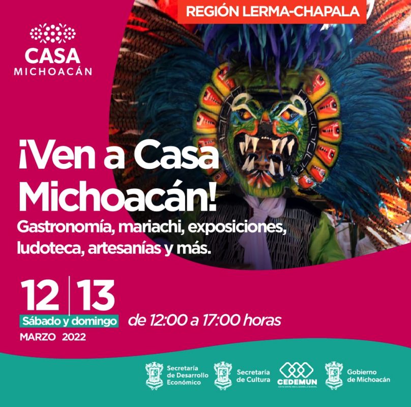 Morelia, Mich., a 10 de Marzo del 2022.- La música, la danza, el folklor y la cocina tradicional de la región Lerma-Chapala de Michoacán destacarán este 12 y 13 de marzo en Casa Michoacán, espacio que celebra su reapertura por parte de la Secretaría de Cultura estatal (SECUM). Las actividades se desarrollarán entre las 12:00 y las 17:00 horas.