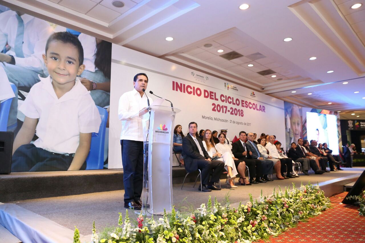 Morelia, Michoacán, a 21 de agosto de 2017.- Pronto dejaremos atrás la historia en que Michoacán era de los estados con mayor rezago educativo, seguiremos trabajando con toda la intensidad para transformar la educación y garantizar enseñanza de calidad para todas y todos, afirmó el Gobernador Constitucional Silvano Aureoles Conejo al dar inicio oficial al Ciclo Escolar 2017-2018, el cual apuntó, será «el ciclo de la educación para la paz».