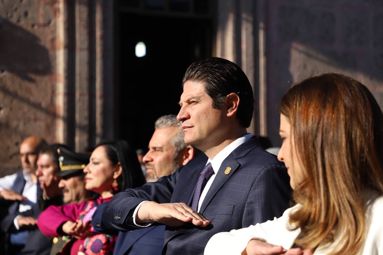 Morelia, Mich., a 27 de Abril del 2022.- La Junta Cívica encabezada por el presidente municipal, Alfonso Martínez Alcázar, en compañía de su esposa y presidenta del DIF Morelia, Paola Delgadillo Hernández, así como del gobernador del estado, Alfredo Ramírez Bedolla, realizaron la colocación del programa del 481 Aniversario de la Fundación de Morelia en recorrido en Bando Solemne, que partió del Ayuntamiento capitalino, hasta rodear las principales avenidas del Centro Histórico.