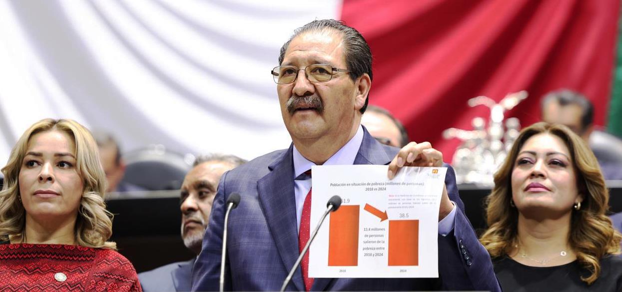 Ciudad de México, a 17 de Septiembre de 2025.- El coordinador del Grupo Parlamentario del Partido del Trabajo (GPPT), diputado Reginaldo Sandoval Flores, afirmó que desde la llegada de la Cuarta Transformación se salido de la pobreza 13.4 millones de mexicanas y mexicanos, lo que demuestra que este modelo de gobierno es todo un éxito.