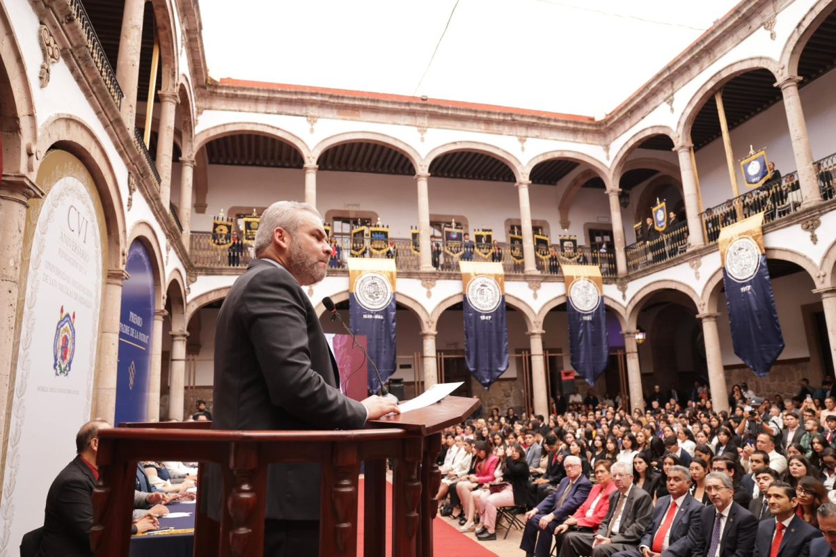 Desde la tribuna nicolaita, el gobernador Alfredo Ramírez Bedolla, en el marco del CVI aniversario de la fundación de la UMSNH, puntualizó que en esta administración se fijó el propósito de hacer crecer a la universidad, por lo que el próximo año se concretará la construcción del Hospital Universitario.
