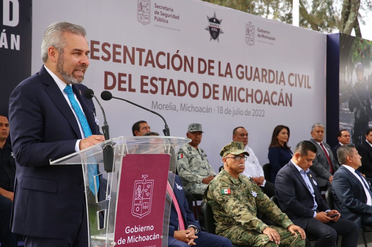 Morelia, Mich., a 18 de julio del 2022.- El gobernador Alfredo Ramírez Bedolla encabezó la presentación de la Guardia Civil de Michoacán, con lo que inicia la transformación y reorganización estratégica de las políticas de seguridad pública en la entidad.