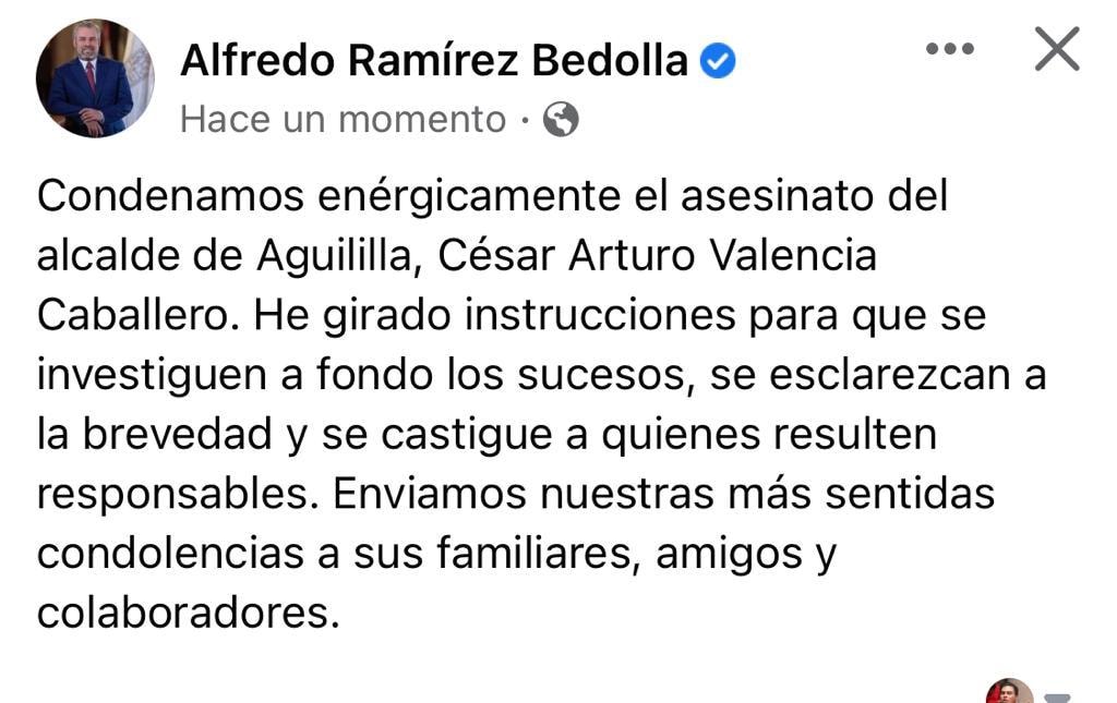 Ramírez Bedolla afirmó que no se escatimará en recursos y medidas necesarias para que a la brevedad se resuelva el caso y se castigue a los responsables del lamentable hecho. Además manifestó su solidaridad y condolencias a familiares y amigos del presidente municipal.