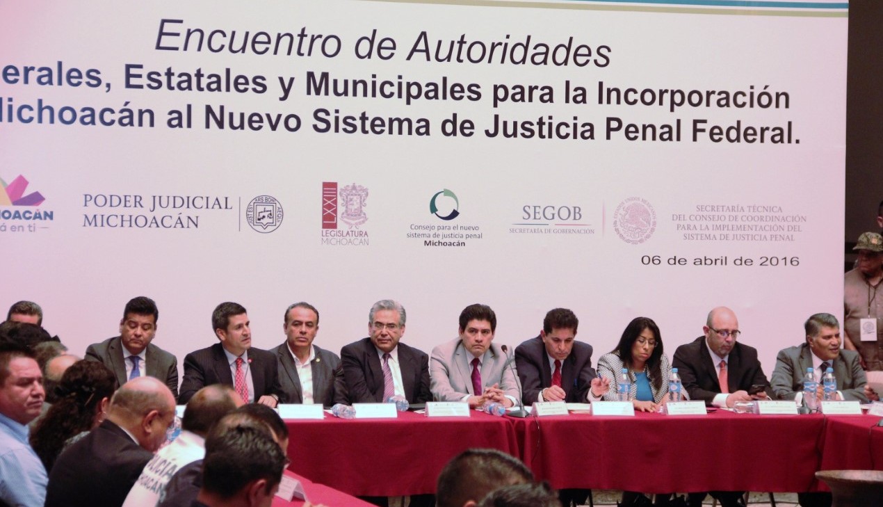 Lo anterior, durante el Encuentro de Autoridades Federales, Estatales y Municipales para la Incorporación de Michoacán al Nuevo Sistema de Justicia Penal, que se llevó a cabo en el Palacio Legislativo con la presencia de los diputados Pascual Sigala Páez Presidente de la junta de Coordinación Política del Congreso del Estado; Juan Bernardo Corona Martínez, presidente de la Comisión de Justicia; así como el Magistrado Moisés Duarte Briz, Coordinador de Magistrados del primer Circuito con sede en Morelia; Magistrado Marco Antonio Flores Negrete, Presidente del Poder Judicial del estado y del Consejo para la Implementación del NSJP; la Delegada Federal de la PGR Bertha Paredes; el Comisario Gral. José Antonio Bernal Bustamante; además autoridades en la materia.