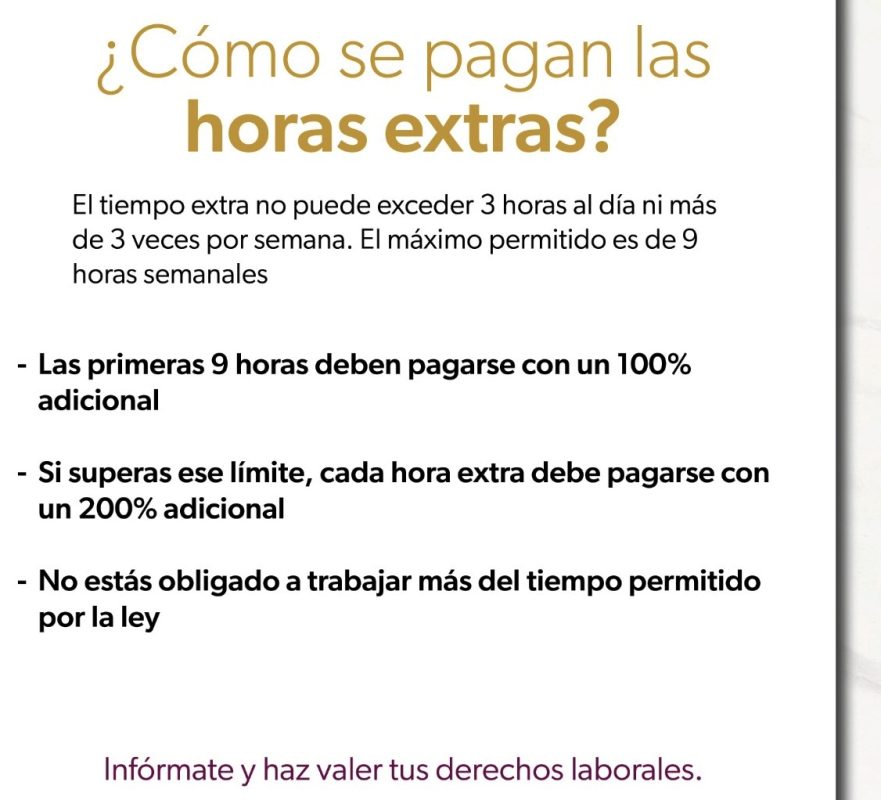 El tiempo extraordinario no puede exceder de tres horas diarias, ni de tres veces por semana y debe pagarse con un 100 por ciento más del salario ordinario. Sin embargo, si se sobrepasan las nueve horas semanales permitidas, el patrón está obligado a cubrir un 200 por ciento adicional sobre el salario correspondiente a esas horas, además de las sanciones establecidas en la ley.