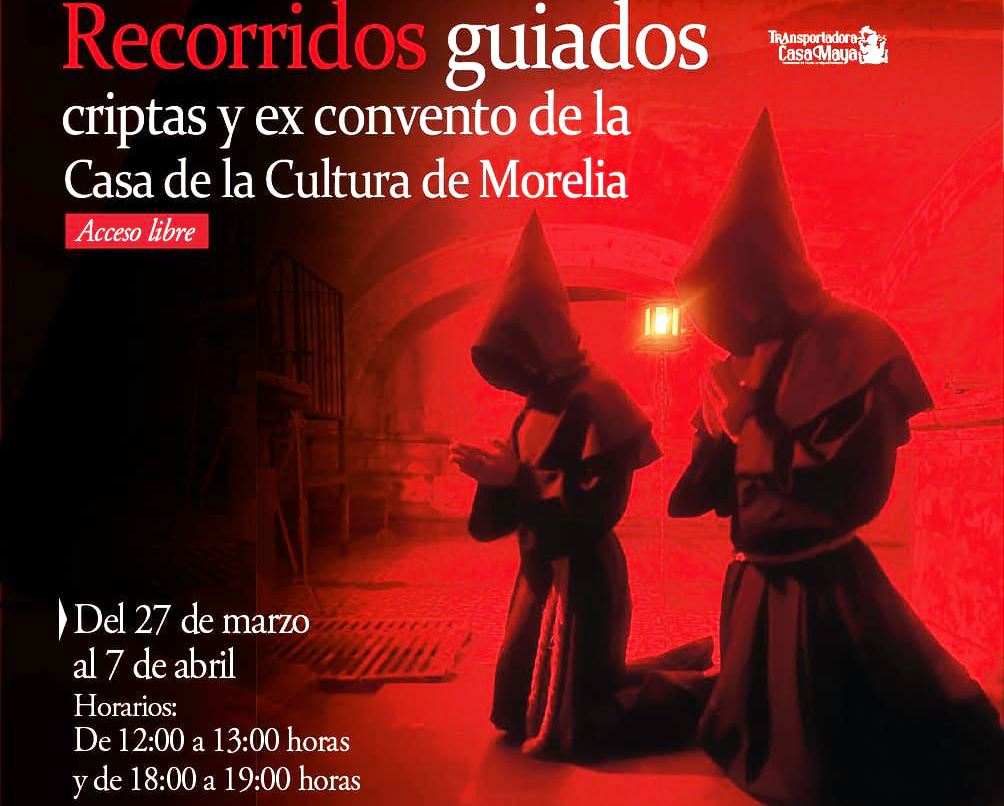 Morelia, Mich, 27 de Marzo de 2024.-  ¿Quieres disfrutar de una experiencia llena de misterio e historias de la época virreinal? Esta Semana Santa la Secretaría de Cultura de Michoacán (Secum) te invita a los recorridos gratuitos por las criptas del Antiguo Convento de los Carmelitas Descalzos, ahora Casa de la Cultura de Morelia.