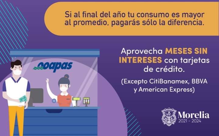 Por ello, el Ayuntamiento de Morelia, que encabeza el presidente Alfonso Martínez Alcázar, invita a los usuarios a aprovechar y solicitar en las cajas del OOAPAS el promedio de su consumo por año, para acceder a dicho beneficio. Si al final del año el consumo es mayor al promediado, los usuarios pagarán sólo la diferencia.