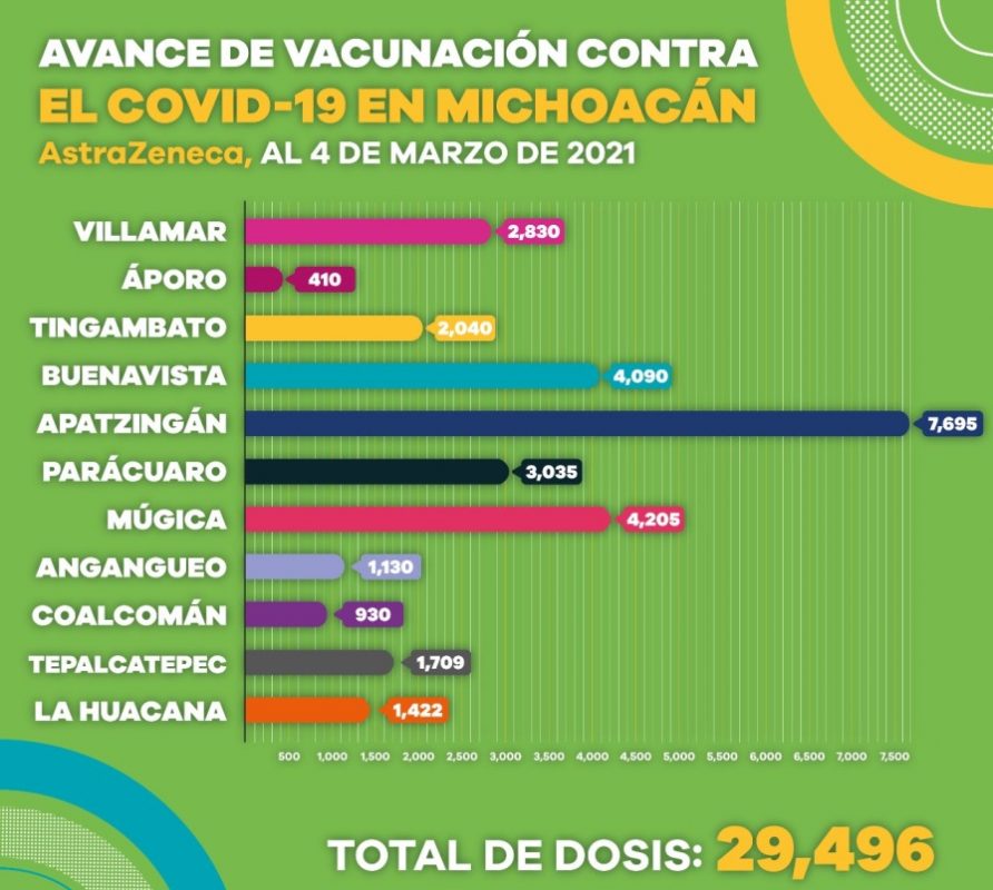 Morelia, Mich., a 4 de Marzo de 2021.- En 13 municipios del estado se han aplicado 36 mil 981 primeras dosis de la vacuna contra COVID-19 a adultos mayores de 60 años, informó la Secretaría de Salud de Michoacán (SSM).