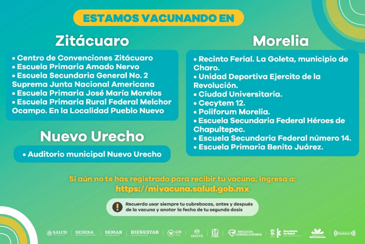 Se hace hincapié a los adultos mayores de 60 años de los municipios de Hidalgo, Lázaro Cárdenas, Coahuayana, Aquila, Arteaga, Maravatío, Tarímbaro, Zinapécuaro, Huetamo, Jacona, Uruapan, Zamora, Ecuandureo, Ixtlán, Villamar, Aporo, Tingambato, Buenavista, Apatzingán, Parácauro, Múgica, Angangueo, Coalcomán, Tepalcatepec, La Huacana, Aguililla y Churumoco que ya recibieron su primera dosis a no bajar la guardia con las medidas básicas de higiene.