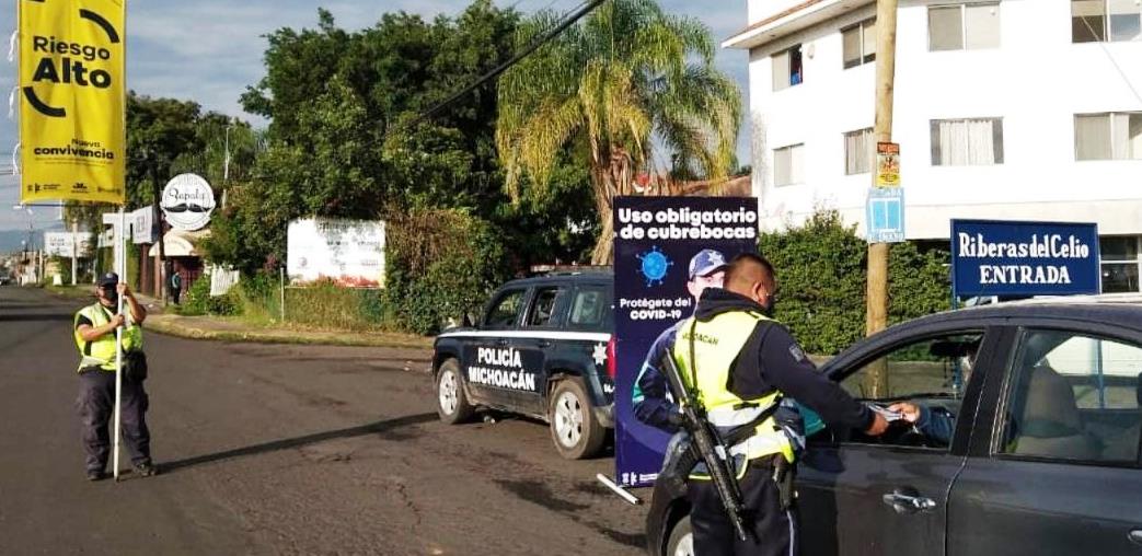 Morelia, Mich., a 8 de septiembre de 2020.- Elementos de la Secretaría de Seguridad Pública (SSP), continúan con el fortalecimiento de labores constantes para controlar la propagación de COVID-19 en cinco municipios del Estado que cuentan con Bandera Amarilla, este color indica que estas demarcaciones se encuentran en riesgo alto de contagio.