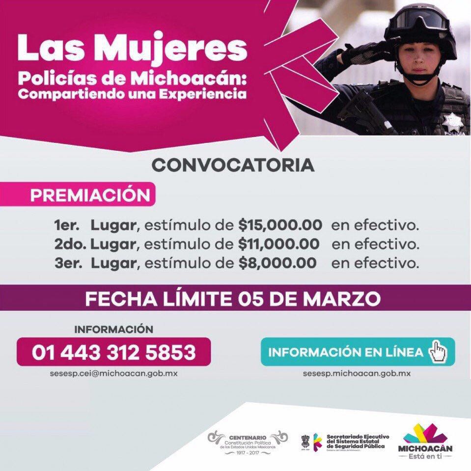 Detalló la convocatoria del concurso «Las Mujeres Policías de Michoacán: Compartiendo una Experiencia», que va dirigido a las mujeres policías operativas, adscritas a las corporaciones policiales estatal, ministerial, del sistema penitenciario y municipal de la entidad, para que narren su historia en un documento de un máximo de cuatro cuartillas en letra Arial, tamaño 12, con un interlineado de 1.5 puntos; deberá llevar la firma de la autora; también, podrán ser postuladas por algún compañero o compañera de trabajo.