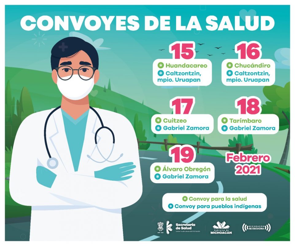 Morelia, Mich, a 14 de febrero de 2021.- La Secretaría de Salud de Michoacán (SSM), informa a la población sobre los lugares en los que se encontrarán los Convoyes de Salud y para Pueblos Indígenas otorgando servicio gratuito, del 15 al 19 de febrero.